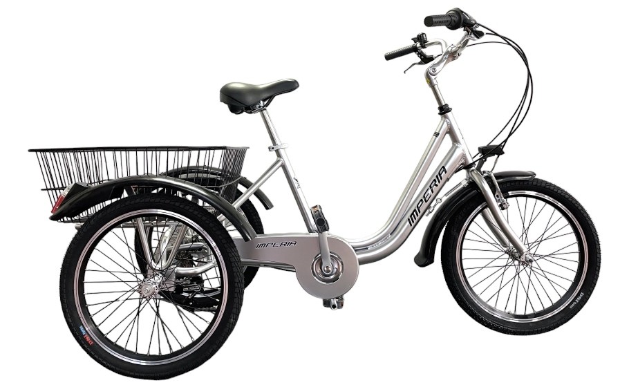 Bici con tre ruote con telaio in alluminio, cambio Shimano e cesto posteriore ideale per lavoro o per fare la spesa. Imperia, marchio parmigiano fondato nel 1974 da Bruno Scarica, tutt'ora commercializzato in esclusiva da Biciclette Scarica.